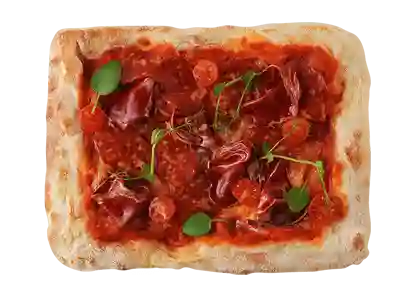 С ветчиной, моцареллой, сыром страчателла, маринованными томатами черри, фисташками и томатным соусом