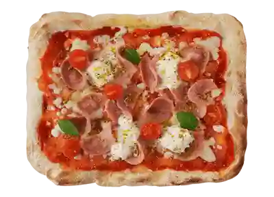 С ветчиной, моцареллой, сыром страчателла, маринованными томатами черри, фисташками и томатным соусом
