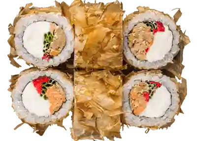 Обжаренный дикий лосось, зелёный лук, стружка тунца, сливочный сыр, икра тобико и соус спайс.