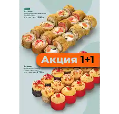 Суши: Сяке - 4шт., Унаги - 4шт., Магуро - 4 шт., Эби - 4 шт. Роллы: Филадельфия, Калифорния, Канада, Сяке Калифорния, Джингл Унаги, Унаги Кранч, Кюран Эби, Эби Шарп, Калифорния Эби, Сяке Кани, Филадельфия Эби, Филадельфия Кани.