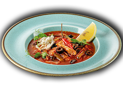 Наваристый суп с пармской ветчиной, пепперони, беконом, куриной грудкой и сыром страчателла.