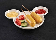 Сосиски из мяса индейки, мука пшеничная, мука кукурузная, яйцо куриное, масло растительное, огурцы,томаты, разрыхлитель пищевой.