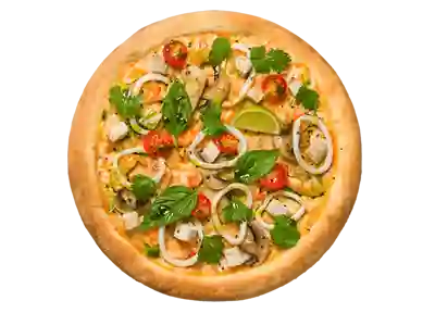 С тигровыми креветками, кальмаром, куриной грудкой, шампиньонами, сыром моцарелла, базиликом и соусом Том Ям