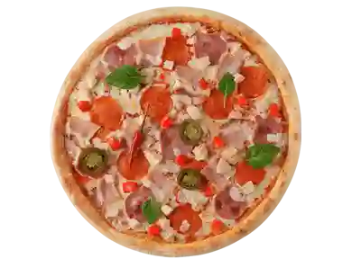 С ветчиной, беконом, куриной грудкой, пепперони, моцареллой, болгарским перцем, перчиком халапеньо и томатным соусом.