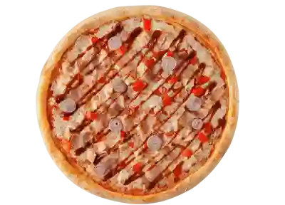 С моцареллой, сочной куриной грудкой, красным луком, болгарским перцем и соусом BBQ.
