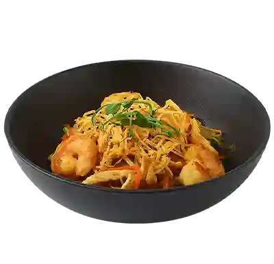 Стеклянная лапша с тигровыми креветками, куриным филе, овощами и соусом карри