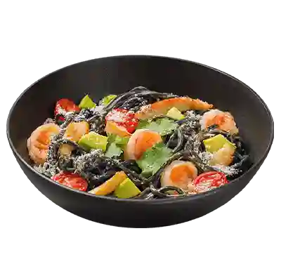 Пшеничная лапша неро с креветками, курицей, сыром блю чиз, пармезаном, авокадо, томатами черри и сырным соусом