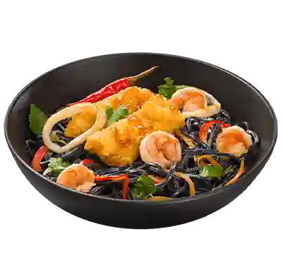 Пшеничная лапша неро с обжаренным палтусом, тигровыми креветками, кальмаром, овощами, зеленью, сливками и устричным соусом