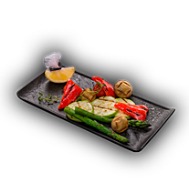 Свежие цукини, болгарский перец, шампиньоны, томаты черри и зелёная спаржа, маринованные в оливковом масле с тимьяном и чесноком, обжаренные на гриле.