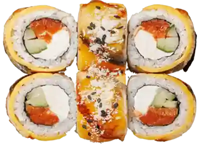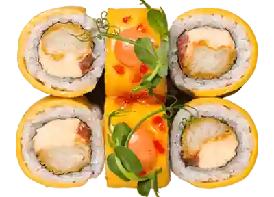 Ролл из снежного краба, огурца, майонеза и свежего филе лосося в чёрном кляре под запечённой шапочкой из трёх видов сыра. Украшен соусом терияки и воздушным рисом.