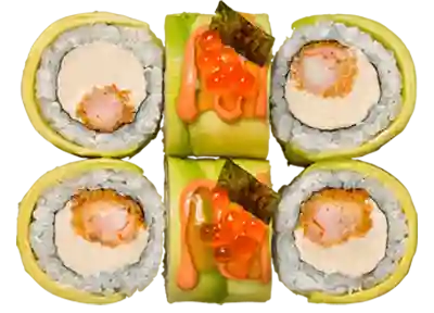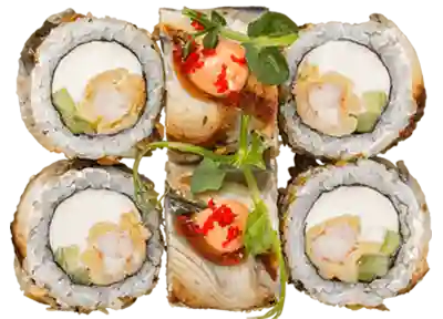 Угорь, креветки темпура, огурец, сливочный сыр, икра тобико, соус спайс, соус терияки и базилик.