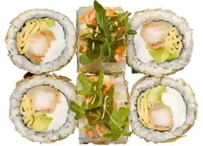 Креветка в воздушной темпуре, сливочный сыр, авокадо, омлет, листья рукколы, соусы спайси и терияки, лепестки миндаля