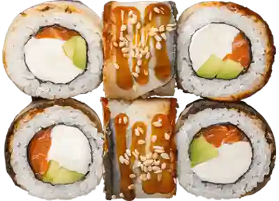 Копчёный угорь, лосось, авокадо и сливочный сыр.