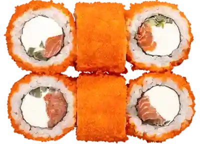Ролл с маринованным в азиатском стиле жареным лососем, сливочным сыром и салатом джаз в икре масаго.