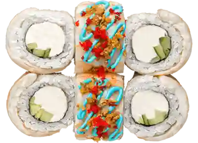 Креветки, сливочный сыр, паста том кха, огурец, лук фри, икра масаго, соус блю кюрасао