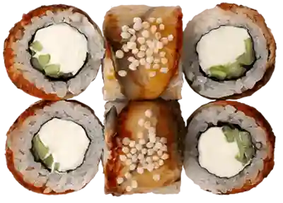 Угорь, сливочный сыр, огурец, соус терияки, воздушный рис
