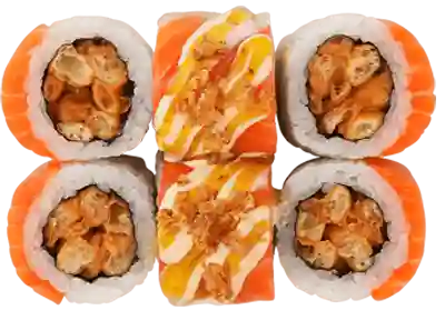 Лосось, хрустящий кляр, лук фри, кунжутный айоли, соус карри манго, соус спайси