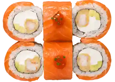 Креветки темпура, копчёный лосось, сливочный сыр, авокадо, соус шрирача, лук сибулет