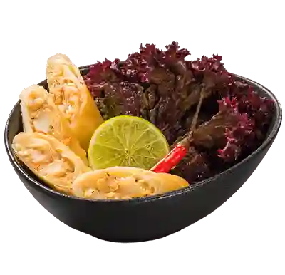 Тёплый салат из говядины карааге, картофеля, томатов черрри, маринованного лука и салата лолло россо. Подается на соусе из пряной кинзы