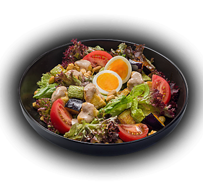 Микс салатов, куриная грудка, цукини, баклажаны, арахис, томаты с ореховым соусом гамадари и соусом ясай - дрессинг.