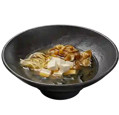 Японский суп с тофу, водорослями вакаме, грибами намеко и луком-пореем