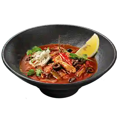 Наваристый суп с пармской ветчиной, пепперони, беконом, куриной грудкой и сыром страчателла.